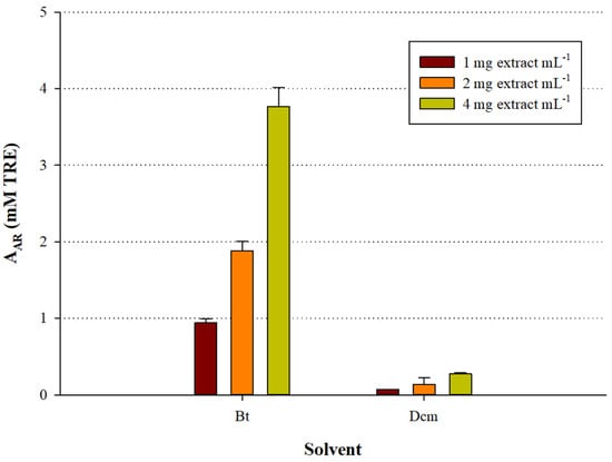 Graph illustrating the AAR of the S. mucronata fractions as a function of extract quantity. Bars indicate standard deviation.