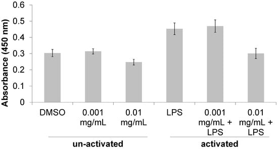 RAW 264.7 murine macrophage cells were cultured in Dulbecco’s Modified Eagle Medium (DMEM) with 10% fetal bovine serum (FBS) +1% antibiotic-antimycotic agent and incubated at 37 °C with 5% CO2. Because of their role in the response to infections, macrophages are typically treated (e.g., activated) with bacterial LPS to elicit a pro-inflammatory response []. LPS was dissolved in DMEM prior to application in cell cultures. For all assays cells were incubated for 16 h prior to treatments. Each assay included a negative control (0.01% v/v DMSO); no pretreatments were used. Cell proliferation was measured 24 h after treatment of cells using a tetrazolium dye (WST-8) cell viability assay kit. TNF-α concentrations were measured 12 and 24 h after treatments using an ELISA kit.