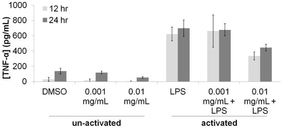 To further investigate this putative reduction of the pro-inflammatory response of macrophages, the concentration of the pro-inflammatory cytokine TNF-α in the supernatant of macrophage cultures was measured using an immunoprecipitation assay (Figure 2). Activation of macrophages with LPS resulted in a 400% increase in the concentration TNF-α, providing evidence for a large pro-inflammatory response. Treatment of the activated macrophages with T. lanatum extract at a concentration of 0.001 mg/mL did not cause any changed in TNF-α concentrations, but treatment with 0.01 mg/mL resulted in a 200% reduction in TNF-α concentrations. These effects were reproducible at 12-h and at 24-h after treatment with LPS and T. lanatum. Results of ANOVA indicated that these effects were significant (PLPS-12h = 7.40 × 10−8; PLPS-24h = 6.57 × 10−10; P0.01mg/mL extract-12h = 1.29 × 10−2; P0.01mg/mL extract-24h = 7.67 × 10−4).