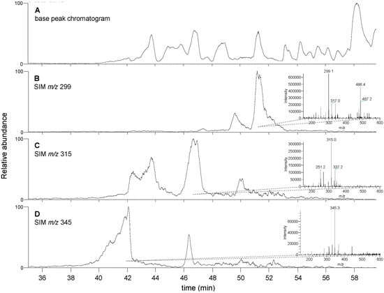 The chemical composition of the T. lanatum extract was analyzed using LC-MS. The base peak chromatogram of the extract was analyzed for m/z signatures characteristic of flavonoid aglycones that have previously been identified in exudates from T. lanatum []. Matching peak profiles were identified for the compounds apigenin-7,4′-dimethyl ether (m/z 299), either scutellarein-6,7-dimethyl ether or 6-hydroxygalangin 5,6-dimethyl ether (isomers, m/z 315) and 6-hydroxy luteolin 6,7,4′-trimethyl ether (m/z 345) (Figure 3). Identification of these compounds was based on matching low-resolution mass signatures.