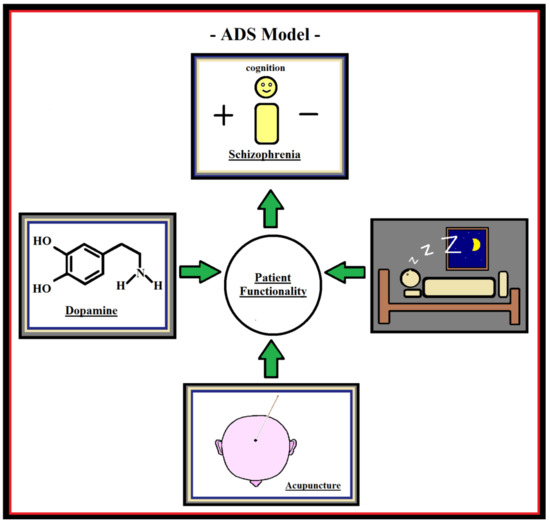 The ADS-model. Acupuncture is able to normalize the dopamine system, which is known to play a role in sleep regulation; thus, by improving sleep, acupuncture is beneficial for a patient suffering from schizophrenia and accompanying sleep disorders.