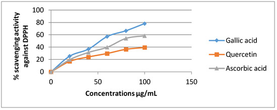 Gallic acid expressed the best antiradical activity (78.21%) compared to quercetin (39.45%) and ascorbic acid (58.41) at 100 µg/mL (Figure 1).