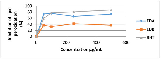 The standard BHT used in this assay exhibited the highest potency against non-enzymatic linoleic acid’s peroxidation with inhibition value of 86.65% at 500 µg/mL.