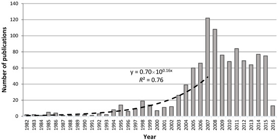 Evolution of published traditional Chinese medicine (TCM) research in the period 1982–2016 (dashed line represents the exponential tendency between 1982 (x = 1) and 2007 (x = 26)). R2 is the coefficient of determination, which gives the percentage variation in “y” explained by the variable “x”.