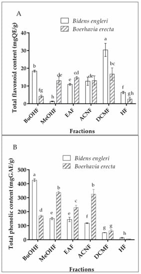 Polyphenolic content of fractions. A—total flavonoid contents; B—total phenolic contents. The data were obtained in two independent triplate tests (n = 2 × 3). The data in each histogram were statistically different (p < 0.05), except for the data with the same letters (a–h). BuOHF: butanol Fraction, MeOHF: methanol fraction, EAF: ethyl acetate fraction, ACNF: acetonitrile fraction, DCMF: dichloromethane fraction, HF: hexane fraction, mgQE/g: milligram quercetin equivalent per gram, mgGAE milligram gallic acid equivalent per gram.