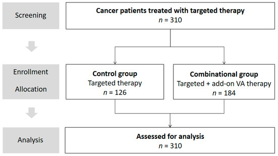 In total, 310 patients were treated; of these 126 patients (40.6%) received targeted therapy without add-on VA therapy (control group). and 184 patients (59.4%) received targeted and add-on VA therapy (combinational group) between January 2010 and June 2017 (see flowchart, Figure 1).