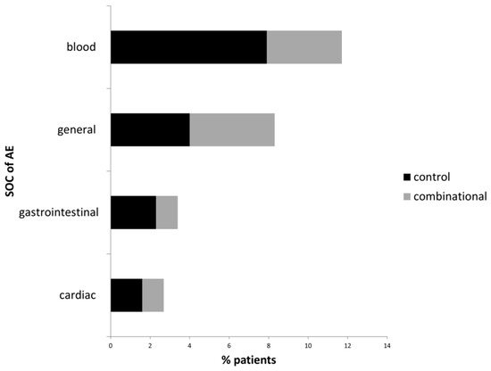 Most frequently (≥2% of patients per group) reported AEs classified by SOC. Black bars, % patients of the control group experiencing an AE; grey bars, % of patients of the combinational group experiencing an AE; SOC: System Organ Class.