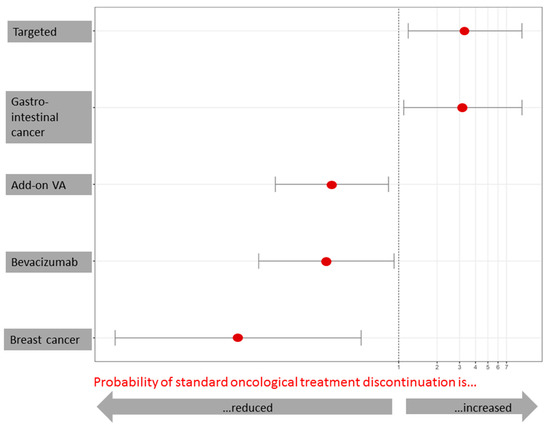 Probability of oncological treatment discontinuation in the AE-experiencing subgroup (n = 34). Adjusted multivariable logistic regression analysis. Factors presented are statistically significant (p < 0.05) for reduced probability (left-hand side from the indicated margin) or for increased probability (right -hand side from the indicated margin) of oncological treatment discontinuation due to adverse side effects, i.e., three times higher probability of discontinuation of standard oncological therapy when applying targeted compared to combined therapy, three times higher probability of discontinuation of standard oncological therapy in gastrointestinal tumors compared to non-gastrointestinal tumors, 70% reduced risk of discontinuation of standard oncological therapy when applying add-on VA therapy compared to targeted therapy without add-on VA therapy, 73% reduced risk of discontinuation of standard oncological therapy when applying bevacizumab compared to therapy without bevacizumab, 94% reduced risk of discontinuation of standard oncological therapy in breast cancer compared to non-breast cancer.