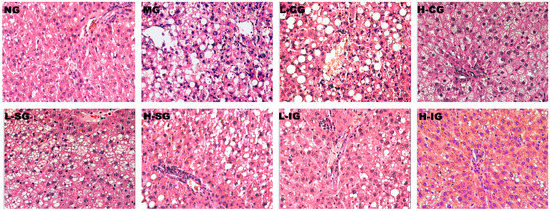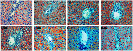 Pathological sections stained with oil red O (Figure 2) presented hepatocytes in the model group, with swelled and suffused red lipid droplets of different sizes. Lipid droplets in the treatment groups were markedly lower than those in the model group especially in the L-IG, H-IG, and H-SG groups.