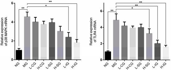 Effects of mRNA expression related to the p38 mitogen-activated protein kinases (MAPK) signaling pathway (n = 6, mean ± S.D.). * p < 0.05, ** p < 0.01. Toll-like receptor (TLR), normal group (NG), model group (MG), low-dose Chaihu–Shugan–San group (L-CG), high-dose Chaihu–Shugan–San group (H-CG), low-dose Shenling–Baizhu–San group (L-SG), high-dose Shenling–Baizhu–San group (H-SG), low dose of integrated-recipes group (L-IG), high dose of integrated-recipes group (H-IG).