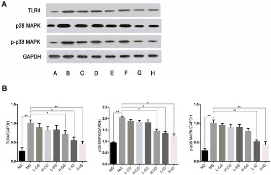 (A) Western blot analysis of proteins involved in the p38 MAPK signaling pathway in hepatocytes. A: (NG), B: (MG), C: (H-CG), D: (L-CSG), E: (H-SG), F: (L-SG), G: (H-IG), H: (L-IG); (B) these proteins were quantified via Western blotting (n = 6, mean ± S.D.). * p < 0.05, ** p < 0.01. Glyceraldehyde-3-phosphate dehydrogenase (GAPDH).