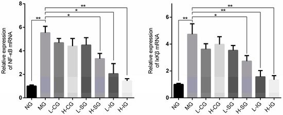 Effects of mRNA expression related to the nuclear factor-κB (NF-κB) signaling pathway (n = 6, mean ± S.D.). * p < 0.05, ** p < 0.01. Inhibitor of nuclear factor kappa-B kinase β (IKKβ).