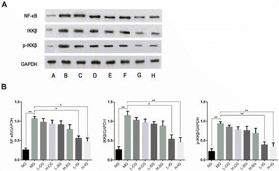 (A) Western blot analysis of proteins involved in the NF-κB signaling pathway in hepatocytes. A: (NG), B: (MG), C: (H-CG), D: (L-CSG), E: (H-SG), F :(L-SG), G:( H-IG), H: (L-IG); (B) these proteins were quantified via Western blotting (n = 6, mean ± S.D.). * p < 0.05, ** p < 0.01.