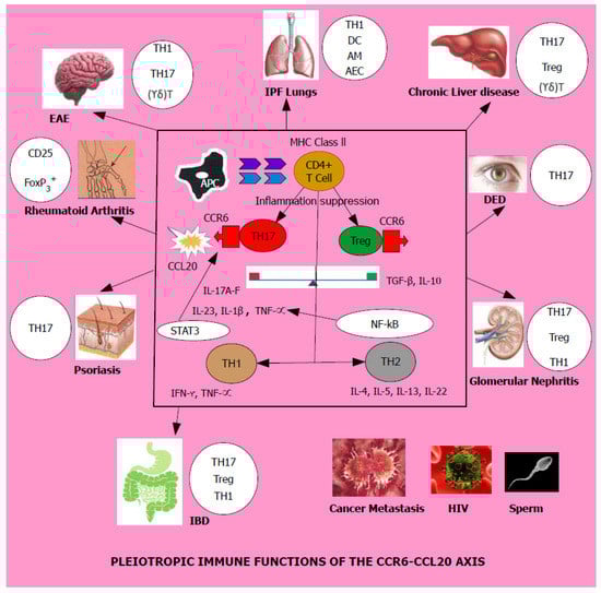 | Organ | CCR6/CCL20 Axis | Cell Types Involved | Disease Produced | References |