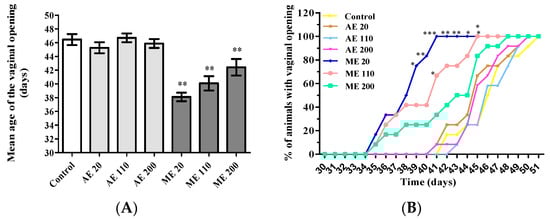 Mean age (A) and percentage (B) of animals with vaginal aperture. Control = animals receiving vehicle (distilled water, 10 mL/kg BW); AE = animals treated with the aqueous extract of M. arboreus; ME = Animal treated with the methanol extract of M. arboreus. Results are shown as the mean ± SEM.; *: p < 0.05; **: p < 0.01; ***: p < 0.001 in reference to control.