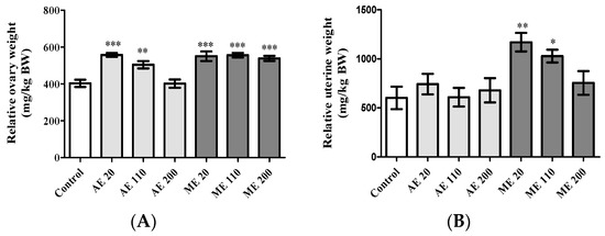 AE increased (p < 0.01) the ovarian relative wet weight at the doses of 20 (557.25 ± 10.69 mg/kg) and 110 (504.43 ± 19.91 mg/kg) mg/kg BW, while ME increased (p < 0.001) it by ~35% at all the tested doses (Figure 2A).