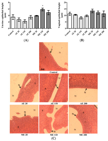 Epithelial height of uteri (A) and vagina (B) as well as microphotographs of uteri sections (C) following treatments. Control = Animals receiving vehicle (distilled water, 10 mL/kg BW); AE = animals treated with the aqueous extract of M. arboreus; ME = animals treated with the methanol extract of M. arboreus. Lu = lumen; Ep = epithelium; St = stroma. Results are shown as the mean ± SEM; *: p < 0.05 in reference to control.
