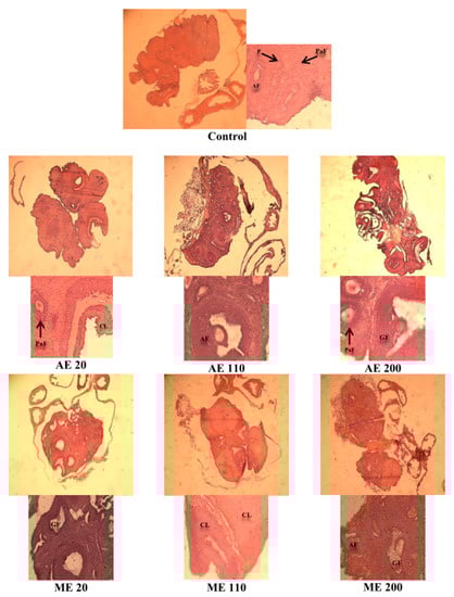 Microphotographs (25× and 200×) of hematoxylin/eosin stained sections of ovaries following a 30-day treatment with aqueous (AE) and methanol (ME) extracts of the leaves of M. arboreus at the doses of 20, 110 and 200 mg/kg. P = primary follicle, PF = primordial follicle, PaF = preantral follicle, AF = antral follicle, GF = Graafian follicle, CL = corpora lutea.