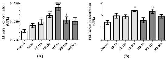 Treatment with AE at the dose of 200 mg/kg significantly increased (0.34%, p < 0.01) the serum levels of LH (Figure 6A), while ME induced it at 20 mg/kg BW (0.52%, p < 0.001) and 110 mg/kg BW (0.24%, p < 0.05). FSH serum levels generally increased following treatments. AE significantly increased it at the only dose of 200 mg/kg BW (64.11%, p < 0.01), while ME increased it (60.99%, p < 0.01) at the dose of 110 mg/kg BW in reference to control (1.44 ± 0.15 UI/L) (Figure 6B).