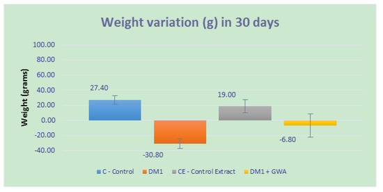 During the experiment (30 days), the animals were submitted to weighing at different times, and Figure 1 displays the variation between weights. The animals in the control group (C) had a weight gain around 27.4 g, while the group that received only GWA extract (in figure CE) had an increase of only 19 g. Animals from DM1 + GWA groups had a weight loss of 6.8 g when compared with DM1 animals, where the major loss is around 30.80 g.
