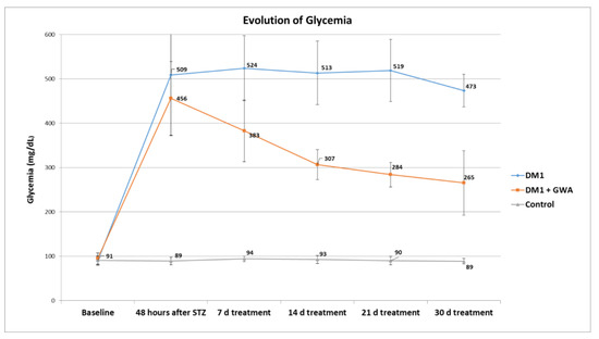 Blood glucose levels evolution during 30 days from Control, DM1 and DM1 + GWA groups. p < 0.01 between DM1 and DM1 + GWA groups.