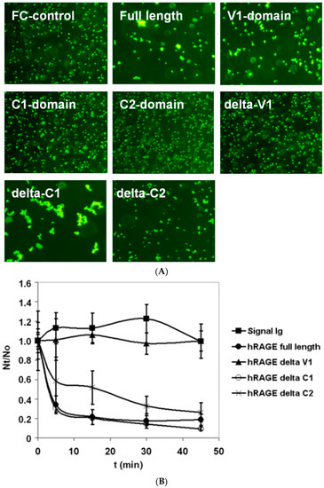 Protein A coated bead aggregation mediated by recombinant Ig-fusion proteins was studied as described [33]. In brief, monomeric fluorescent protein A coated beads were incubated with 10 μg/mL of different sRAGE–Ig forms and aggregation was monitored using fluorescence microscopy (Olympus, Tokyo, Japan). Pictures were taken after 60 min bead aggregation. The extent of bead aggregation is represented by the index Nt/N0. Nt and N0 are the total number of particles at incubation times t and 0, respectively.