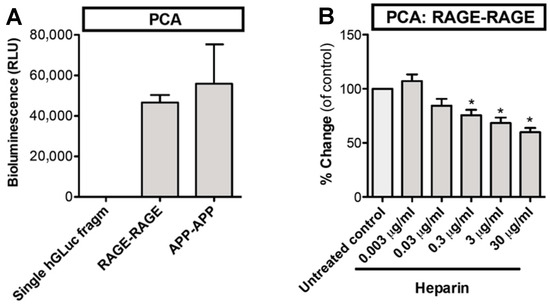 Homophilic interactions of RAGE on the living cell surface are inhibited by heparin. (A) Cells were transfected with full length RAGE–cytoplasmic hGLuc fragment chimeras. RAGE self-association was measured with luciferase activity. hDLuc fragment chimeras of APP served as a positive control of homodimerization. (B) RAGE self-association was partially inhibited by heparin. N = 3–4; error bars represent ±SD. * = p < 0.05 when compared with untreated control. hGLuc = humanized Gaussia luciferase, RLU = relative light unit, PCA = protein-fragment complementation assay, APP = amyloid β.