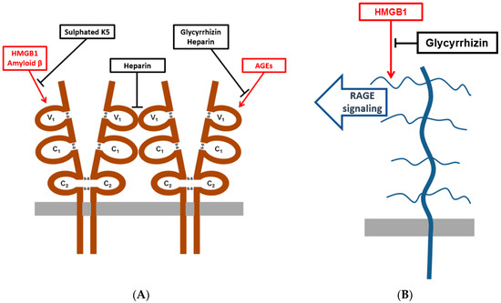 Schematic picture showing RAGE and HMGB1 antagonists used in this study. (A) A schematic picture showing RAGE extracellular V1-domain mediated interactions that were inhibited by glycyrrhizin, sulphated K5 oligosaccharides, and heparin in this study. (B) A schematic picture showing the predicted extracellular sulphated glycosaminoglycan binding of HMGB1 and inhibition of binding and RAGE signaling by glycyrrhizin.