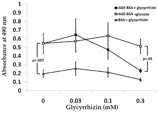 Plastic Maxisorb microwells (Sigma-Aldrich) were coated with 20 μg/mL of AGE-BSA [35] and blocked with BSA. sRAGE–Ig protein (0.1 μg/mL) was incubated in wells in the presence of various amounts of glycyrrhizin. Bound proteins were quantified using horse radish peroxidase conjugated goat anti-human IgG (Sigma-Aldrich). The color was developed with peroxidase substrate. Absorbance was measured at 450 nm.