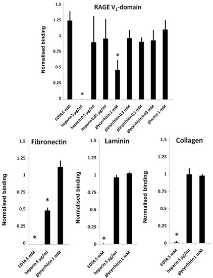 AGE-BSA binding to RAGE induces receptor dimerization and signaling [47]. Here, we studied whether glycyrrhizin interferes with binding of RAGE to AGE-BSA. In a microwell binding assay, 300 µM glycyrrhizin inhibited RAGE binding to AGE-BSA coated microwells (Figure 4). The effect of glycyrrhizin on RAGE–AGE interactions was also tested in cell adhesion assay. PC3 cells express endogenously synthetized AGEs on their surface, which mediate cell binding to RAGE [40,48,49]. PC3 cells adhered to RAGE V1-domain, but not to C1- or C2-domains ([40]; data not shown). Glycyrrhizin at 1 mM concentration inhibited PC3 cell binding to RAGE V1-domain, but not to the control proteins fibronectin, laminin, or collagen. Furthermore, heparin inhibited cell binding to both RAGE V1-domain and fibronectin, but not to laminin and collagen. In contrast, EDTA inhibited cell binding to fibronectin, laminin, and collagen, but not to RAGE V1-domain (Figure 5). The finding that the cell binding to RAGE occurs independently of divalent cations excludes the role of Mac-1 integrin in the binding [45]. Our results indicate that AGE binding to RAGE can be inhibited by glycyrrhizin and heparin (Figure 3A).