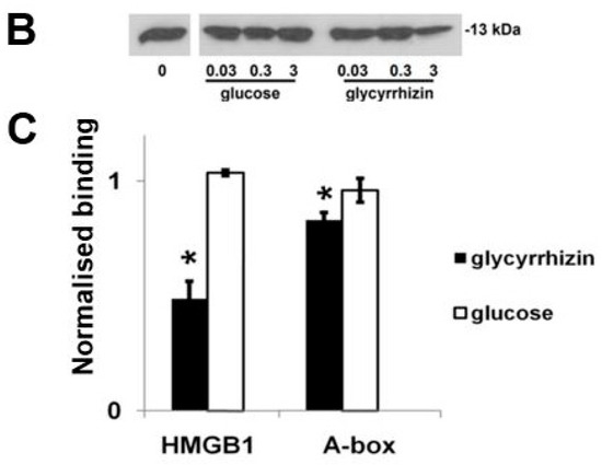 Next, we tested whether glycyrrhizin can inhibit heparin binding in heparin–Sepharose chromatography. The excess of glycyrrhizin prevented HMGB1 binding to the chromatography column (Figure 6A). Further, a heparin–Sepharose column bound HMGB1 was eluted with a glycyrrhizin gradient at the same concentration of glycyrrhizin as the control protein thrombin ([58]; data not shown). Next, we studied the effect of glycyrrhizin on heparin binding of full-length HMGB1 and A-box using a heparin–Sepharose precipitation assay. Glycyrrhizin inhibited binding of both the full-length HMGB1 and the A-box (Figure 6B,C). These results indicate that the A-box and the full length HMGB1 bind to heparin in a similar manner, and that their binding to heparin is inhibited by millimolar concentrations of glycyrrhizin. It is tempting to speculate that glycyrrhizin might inhibit RAGE signaling via interfering HMGB1–heparan sulphate interactions (Figure 3B).