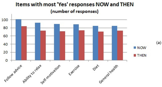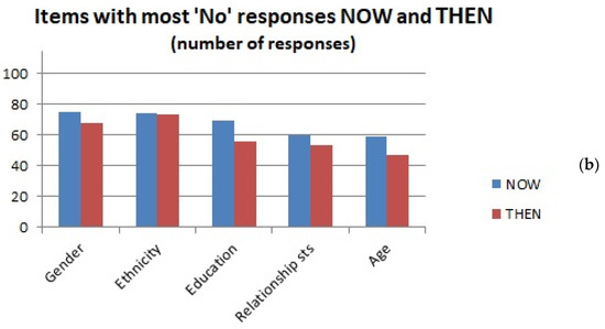 A Mann–Whitney test indicated that significantly more women than men gave “Yes” (THEN) responses (two-tailed significance, U = 941.5, p = 0.007), but this difference was not significant for the “Yes” (NOW) responses (p = 0.071). Conversely, men provided significantly more “Don’t know” (THEN) responses (i.e., did not answer these questions) than women (U = 1000.0, p = 0.018).
