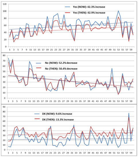 There are clear trends in the numbers of “Yes” and “No” responses to the 60 main questions over the course of the survey, with considerable agreement between the NOW and THEN responses, but rather less pronounced trends in the numbers of “Don’t know” responses (Figure 4).