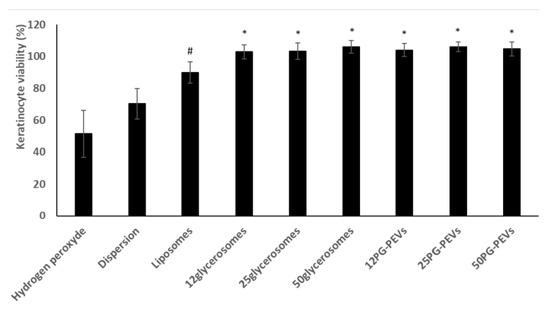 Figure 2). Glycerosomes and PG-PEVs displayed the highest ability to counteract the harmful effect of hydrogen peroxide, regardless of the amount and type of glycol used, re-establishing healthy conditions.