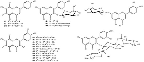 | 3 | Cynaroside b | Whole plant (MeOH or ButOH) [28] Aerial (leaves and stems) parts (EtOH) [22] Epigeal part (MeOH) [30] | S. atropurpurea [22] S. olgae [30] S. tenuis [28] S. argentea [28] |