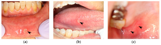 Aphthous stomatitis that occurs in a patient with recurrent aphthous stomatitis (RAS). Images are of the same patient and were taken on the same day. (a) Lower labial mucosa. (b) Right margin of the tongue. (c) Right hard palate mucosa (black arrowheads).