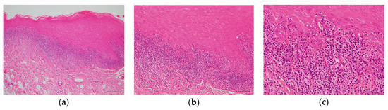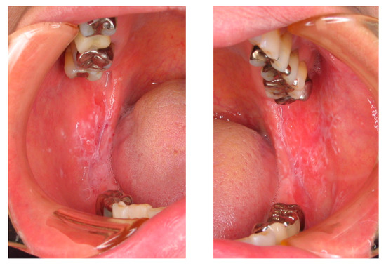 In typical cases, OLP occurs as a reticular white spot at the buccal mucosa (Figure 2). Occasionally, OLP occurs as erythematous lesions with erosion and ulcers. As these symptoms cause discomfort, contact pain, or both in affected subjects, OLP is an intractable disease that may impair the quality of life of patients. The clinical manifestation of OLP varies and presents as white spots that may be reticular, plaque-like, papular, linear, or circular and may occur together with atrophic erythematous, erosive, ulcerative, or rarely bullous-type lesions [12,13]. OLP is diagnosed based on clinical findings such as the previously mentioned pathognomonic gross appearance and the histopathological examination of lesional tissues by biopsy. Pathognomonic histopathological findings are shown in Figure 3. Predisposing factors are not clear yet, but some implicated etiological triggers or aggravating factors of OLP are shown in Table 5 [14,15,16].