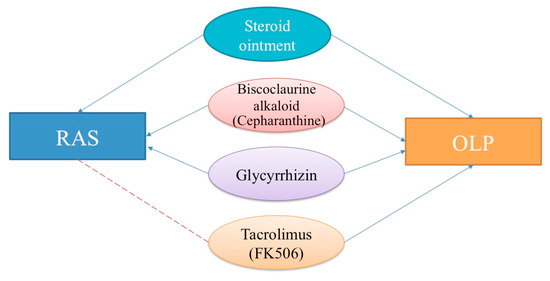 Therapeutic topical and systemic agents for recurrent aphthous stomatitis (RAS) and oral lichen planus (OLP). Blue lines with arrowheads: effective. Red dashed lines: probably effective.