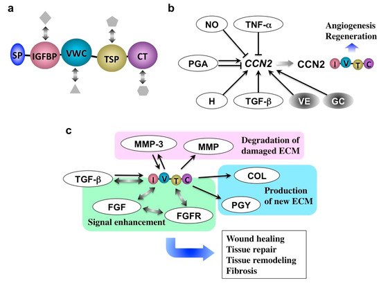 (a) Molecular structure of CCN2. Following the signal peptide for secretion (SP), insulin-like growth factor binding protein-like (IGFBP), von Willebrand factor type C repeat (VWC), thrombospondin type I repeat (TSP), and C-terminal cystine knot (CT) modules are connected in tandem. Interaction with multiple co-factors (objects in grey) that support the function of CCN2 is also illustrated. (b) CCN2 inducers and repressors. TNF-α, tumor necrosis factor alpha; NO, nitric oxide; PGA, prostaglandin; H, histamine; TGF-β, transforming growth factor beta; VE, vitamin E; GC, glucocorticoid. (c) Molecular action of CCN2. MMP, MMPs other than MMP-3; COL, collagen; PGY, proteoglycan; ECM, extracellular matrix; FGFR, fibroblast growth factor receptor; FGF, fibroblast growth factor. Arrows and T-bars indicate induction and repression, respectively. Bidirectional arrows denote direct molecular interactions.