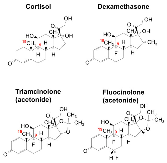 Chemical structures of glucocorticoids. The positions of C9 and C19 are indicated in red.