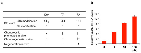 (a) Structural–functional relationship of three glucocorticoids. TA, triamcinolone acetonide; FA, fluocinolone acetonide. (b) Induction of CCN2 in ATDC5 chondrogenic cells by FA. ATDC5 cells in monolayer culture were treated with different concentrations (1–100 nM: horizontal axis) of FA for 24 h, and analyzed for expression levels of CCN2 mRNA.