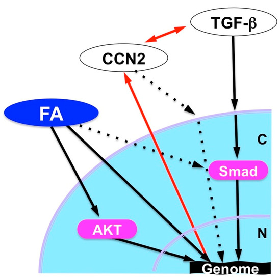 FA dramatically enhanced the chondrogenesis from mesenchymal stem cells in vitro when it was combined with transforming growth factor (TGF)-β3. Furthermore, analysis in vivo revealed the ability of FA to regenerate damaged articular cartilage in collaboration with TGF-β3 [55]. TGF-β3, as a member of the TGF-β superfamily, is known to enhance extracellular matrix deposition mainly through the canonical signaling pathway mediated by secondary messengers termed Smads. The observed effect of FA was shown to be mediated by the mammalian target of the rapamycin (mTOR)-AKT signaling pathway as well as by the interaction with the Smad pathway and GR activation. This collaboration is highly member-specific, since FA combined with BMP-2, another member of TGF-β superfamily, did not show such an effect. Similarly, articular cartilage regeneration in vivo was not effectively exerted by the combination of TGF-β3 and either TA or Dex. A structural comparison between these three compounds suggests a structural–functional relationship between corticosteroids and the extra functionality to regenerate cartilage in collaboration with TGF-β3 (Figure 7a) [55]. Obviously, the fluoride modification at C16 adds a structural property to enable the unusual collaboration of FA with TGF-β. It should also be noted that FA is able to strongly induce CCN2 expression in ATDC5 chondrogenic cells, which may result in the modification of TGF-β signaling via direct molecular interaction between these molecules (Figure 7b). Since CCN2 itself regenerates articular cartilage, involvement of this protein in the outcome of FA-TGF-β3 collaboration is strongly suspected (Figure 8).