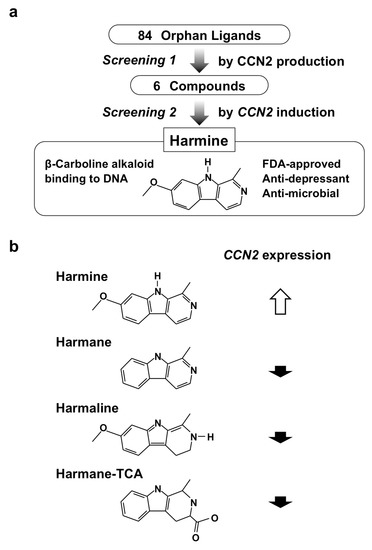 (a) Screening procedure employed for the re-discovery of harmine; (b) chemical structures and CCN2 inducing the activity of β-carboline alkaloids.