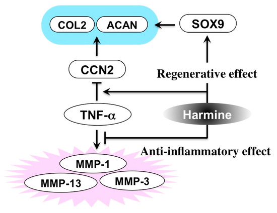 In addition to this novel discovery, the anti-inflammatory effect of this compound was surprisingly also indicated in the same study. Indeed, harmine was shown to protect chondrocytes from the catabolic effects conferred by an inflammatory cytokine, TNF-α (Figure 10) [57]. Therefore, therapeutic use of this compound in OA, including that of TMJ, could well be considered. Also, such a molecular function of this particular alkaloid, counteracting inflammatory response and enhancing regenerative activity, is reminiscent of that of glucocorticoids. Thus, harmine may be an effective agent for the treatment of stomatitis as well, which ought to be examined in future studies.