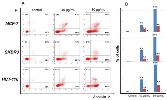 To analyze the type of cell death (apoptosis or necrosis) induced by compound 6 on MCF-7, SKBR3, and HCT-116 cells, cells were stained with annexin V which binds phosphatidylserine exposed on the surface of apoptotic cells and PI which intracellulary stains the DNA of necrotic cells. As shown in Figure 2, 80 μg/mL of compound 6 drove ca. 50% of all cells to apoptosis. Specifically, 44.9% of MCF-7 were annexin V+ and 12.3% annexin V+/PI+, suggesting that cells exposed to compound 6 underwent early apoptosis and a small percentage thereof late apoptosis/necrosis. Analogous percentages were obtained for SKBR3 (40.1% early apoptotic; 9.1% late apoptotic/necrotic) and HCT-116 (43.1% early apoptotic; 10.2% late apoptotic/necrotic) cells. When the same cell lines were exposed to 40 μg/mL of compound 6, the percentages of early apoptotic and late apoptotic/necrotic cells were reduced ca. by 50% (13.5–20.1% and 3.9–6.5%, respectively), suggesting that induction of apoptosis by compound 6 is concentration-dependent.