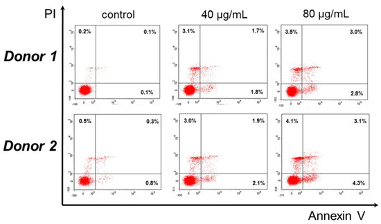 Based on the significant cytotoxic activity of compound 6 against cancer cell lines we further tested whether it may also be toxic against normal cells, i.e., PBMCs isolated from two different healthy blood donors. PBMCs were incubated for 24 h with the IC50 and the 1/2 concentration of 6, stained and analyzed by flow cytometry. Interestingly, the IC50 of compound 6 (80 μg/mL) induced early and late apoptosis/necrosis in a small percentage of PBMCs (2.8% and 3.0% for donor 1; 4.3% and 3.1% for donor 2, respectively). At half concentration, the percentages were highly reduced and much less early apoptotic and late apoptotic/necrotic cells were detected (1.8% and 1.7% for donor 1; 2.1% and 1.9% for donor 2, respectively) (Figure 3).