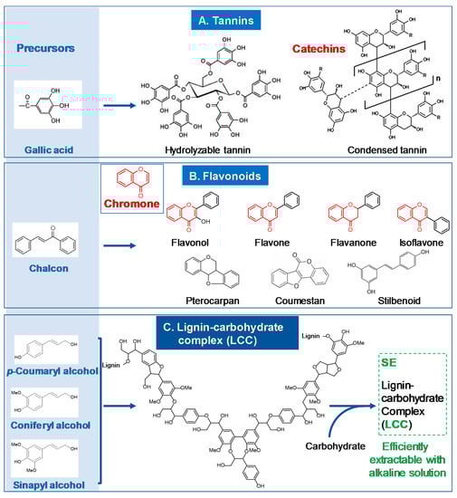 Three major polyphenols, that is tannins (A), flavonoids with or with backbone structure of chromone (B) and lignin-carbohydrate complex (LCC) (C), in the natural kingdom. Cited and modified from Reference [4] with permission.