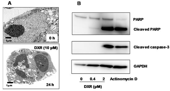 Doxorubicin induced apoptosis in human oral keratinocyte, demonstrated by transmission electron (A) and western blot analysis (B). Cited from Reference [27] with permission.