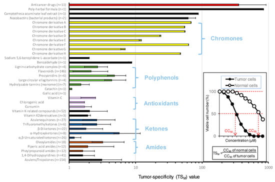Chromone derivatives showed higher tumor-specificity (TSM) value than most of the polyphenols. TSM was determined by the following equation: TSM = (mean CC50 for human OSCC cell lines/mean CC50 for human normal oral mesenchymal cells. Tumor and normal cells in the insert represent human OSCC cell lines and human normal oral mesenchymal cells. Data of chromones [30,32,33,34,35,36,37,38] and other compounds [4] were cited with permission. n, number of compounds tested.