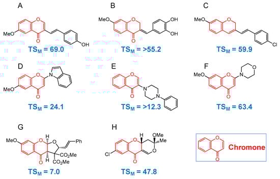 Chromone (4H-1-benzopyran-4-one) is a backbone structure of flavonols, flavones, flavanones and isoflavones [29] (Figure 1B). We synthesized eight classes of chromones derivatives (total 134 compounds): 3-styrylchromones (15 compounds) [30,31] (containing compound A), 3-benzylidenechromanones (17 compounds) [32] (containing compound B), 3-styryl-2H-chromenes (16 compounds) [33] (containing compound C), 2-azolylchromones (24 compounds) [34] (containing compound D), 3-(N-cyclicamino)chromones (15 compounds) [35] (containing compound E), 2-(N-cyclicamino)chromones (15 compounds) [36] (containing compound F), furo[2,3-b]chromones (12 compounds) [37] (containing compound G) and pyrano[4,3-b]chromones (20 compounds) [38] (containing compound H). The eight compounds that produced the highest TS value in each group are listed in Figure 4.